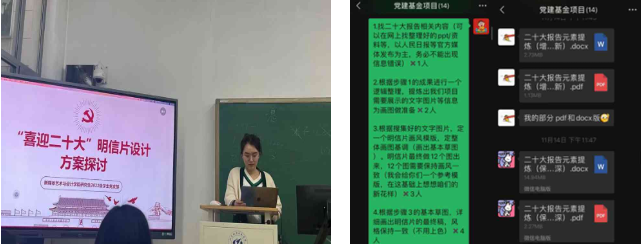 根据党建基金创新项目要求,党支部积极推进党支部规范化建设工作,培育和创新党建工作品牌,实事求是,并充分结合学科特色特性,以理论学习为基础,进行实物转化。同时,项目还立足学生党员的身份特点,有针对性的在理论学习方面进行了分析,最终确定了以党的二十大为主题进行广泛宣传的内容形式。在活动形式的开展方面,党支部经过充分讨论,分析其它支部的做法,借鉴样板支部的经验,最后确定了将理论学习转化为明信片的成果展现。