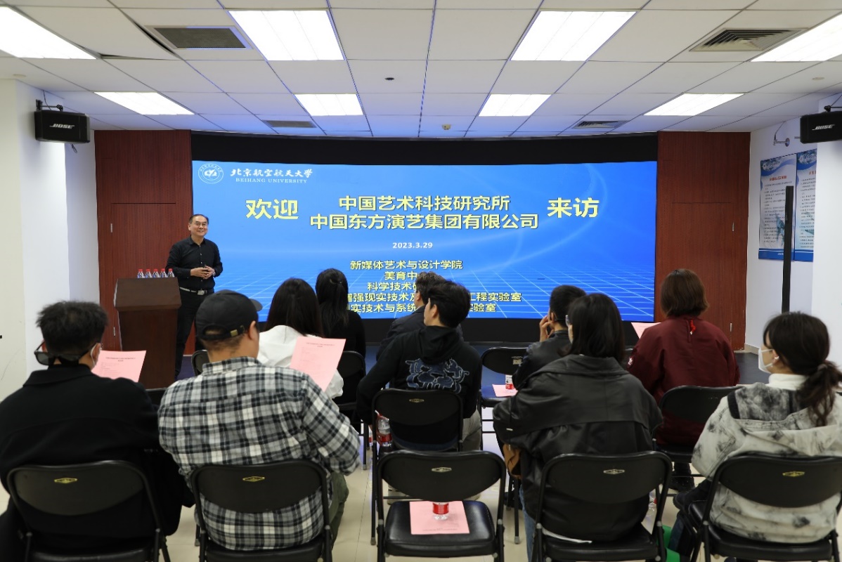 2023年3月29日下午,中国艺术科技研究所副所长庹祖海、科研规划处处长张晓华、数字艺术部刘浩洋、解超云,中国东方演艺集团有限公司副总经理张蕾、北京东方新大陆文化艺术有限公司副总经理邹一鸣、吴杉,项目部经理王雯雯、李喆等一行到访凯发k8 、美育中心、虚拟现实技术与系统全国重点实验室交流并进行深入座谈。北航科学技术研究院、计算机凯发k8、凯发k8 、美育中心负责人等参加座谈。