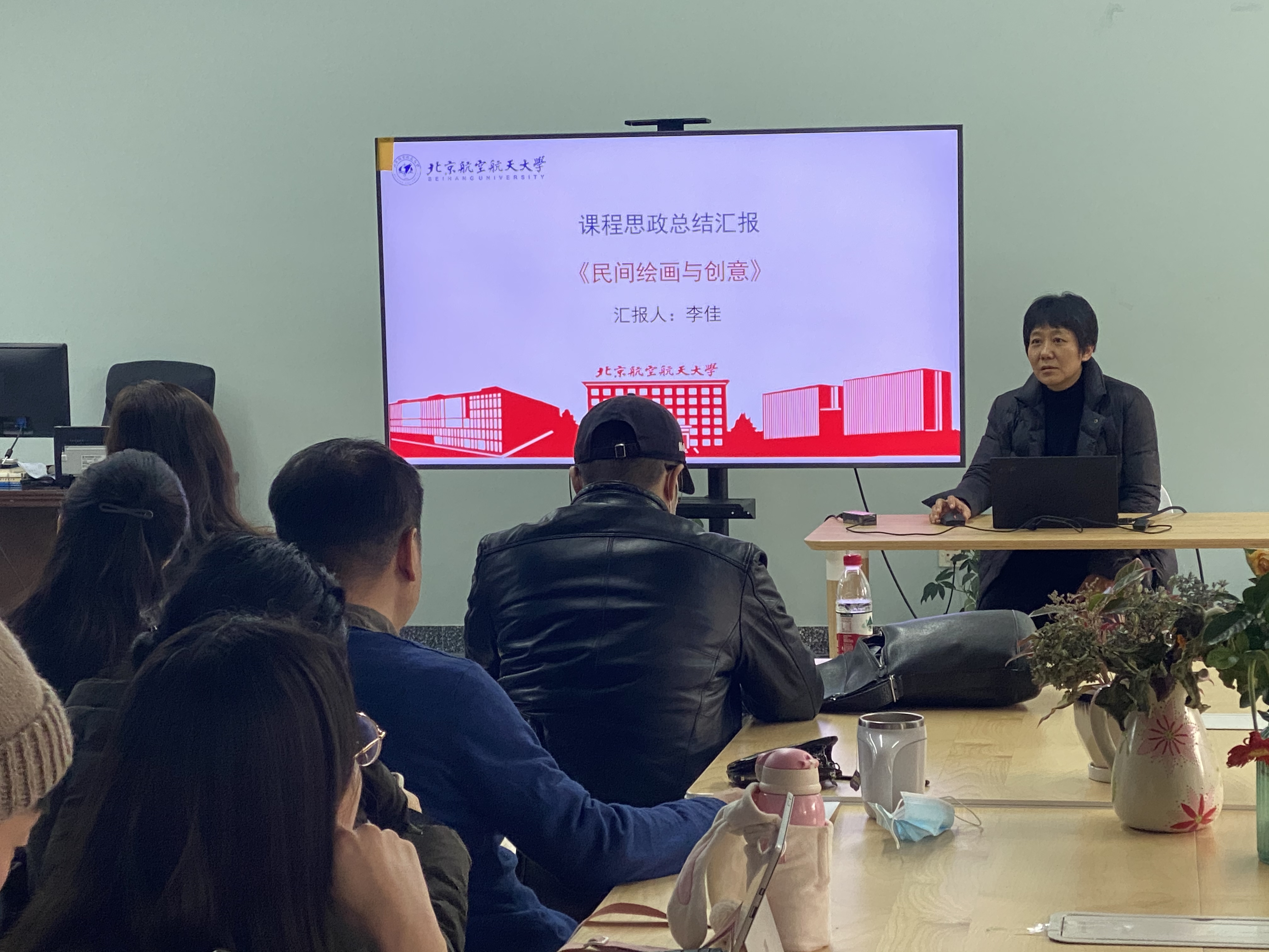 128日下午,凯发k8在新主楼B332组织全体教职工“学习日”活动,李佳老师在会上就北航课程思政示范课程《民间绘画与创意》进行了分享交流,学习内容主要包括:课程基本情况、课程团队情况、课程教学情况,总体设计情况、教学实践情况、课程建设成效、特色与创新等方面。结合北航创新型、综合型、实用型艺术人才培养的目标定位,根据北航艺术专业的特色和优势,深入研究和提高艺术审美素质为目标。在教学中引导学生立足时代、扎根人民、深入生活,树立正确的艺术观和创作观。坚持以美育人、以美化人,积极弘扬中华美育精神,自觉传承和弘扬中华优秀传统文化,全面提高学生审美和人文素养,增强文化自信。