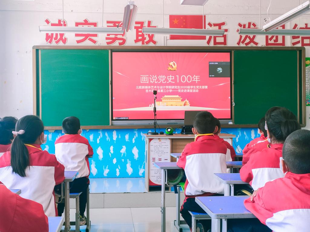 制作完成的立体书通过邮寄的方式寄到小朋友的手中,2021年4月21日下午,凯发k8 研究生2020级学生党支部与新疆维吾尔自治区昌吉回族自治州吉木萨尔县第三小学的老师和五(7)班的同学们,通过线上视频会议的形式,开展了一场活泼生动的《画说党史100年》进课堂活动。在党史进课堂活动的现场,参与设计的党员用生动的语言向小朋友们讲解立体书每部分背后的故事并展示设计创意,让小朋友们在趣味阅读与动手实践的过程中增强了党史知识学习和理解。