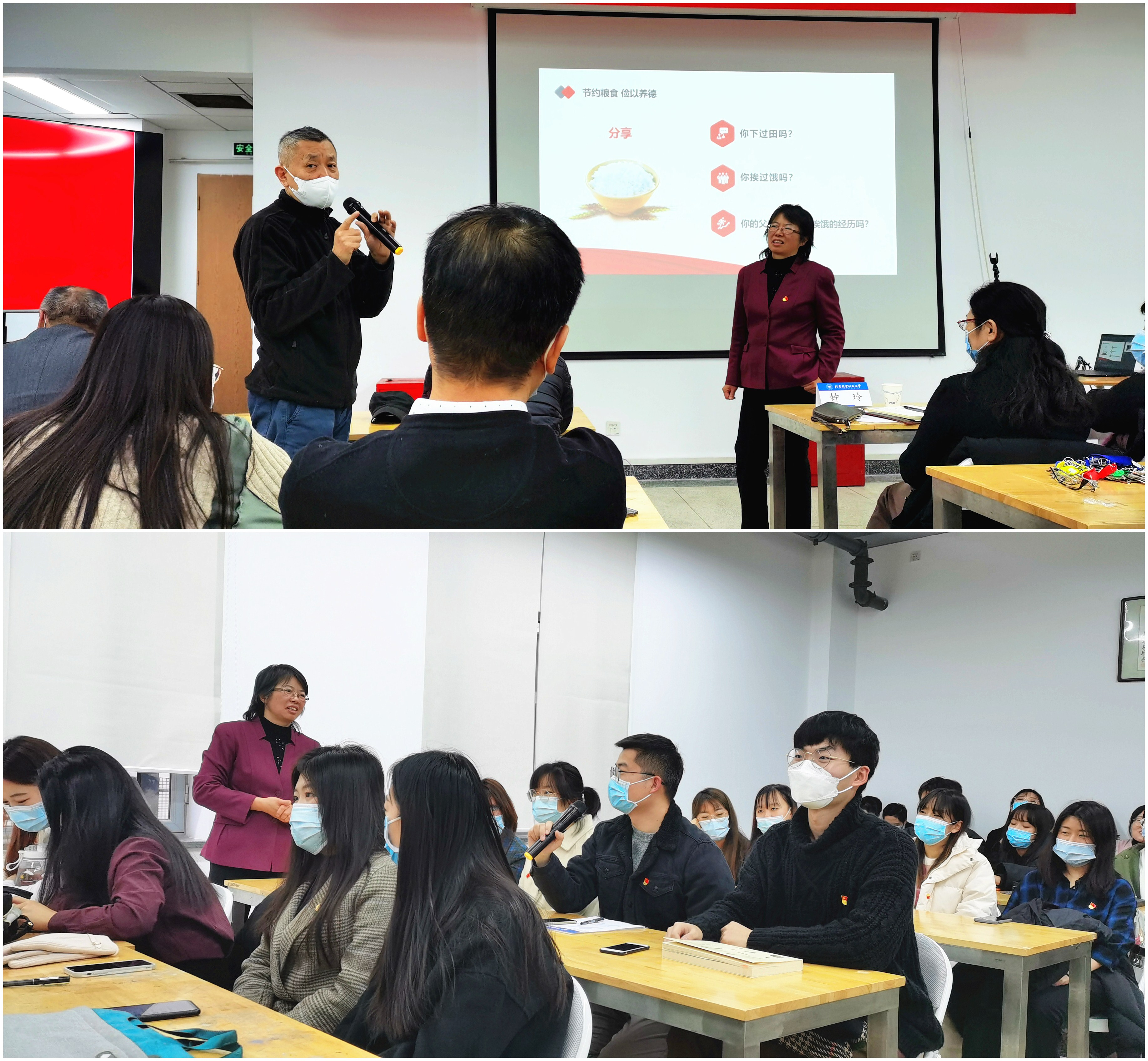 王群首先领学主讲了2020年8月习近平总书记对制止餐饮浪费行为作出的重要指示精神,“餐饮浪费现象,触目惊心、令人痛心!”引发全体师生党员的深刻反思。“俭,德之共也;侈,恶之大也。”日前,中央发出了在全社会营造浪费可耻、节约为荣氛围的动员令。早在2013年年初,习近平总书记就作出重要指示,强调“浪费之风务必狠刹”,号召“努力使厉行节约、反对浪费在全社会蔚然成风”。今年是全面建成小康社会目标实现之年,是全面打赢脱贫攻坚战收官之年。从明年开始,我国将进入“十四五”时期,这是在全面建成小康社会基础上开启全面建设社会主义现代化国家新征程的第一个五年,所以更是要高度重视粮食安全和提倡“厉行节约、反对浪费”的社会风尚,制止餐饮浪费行为。