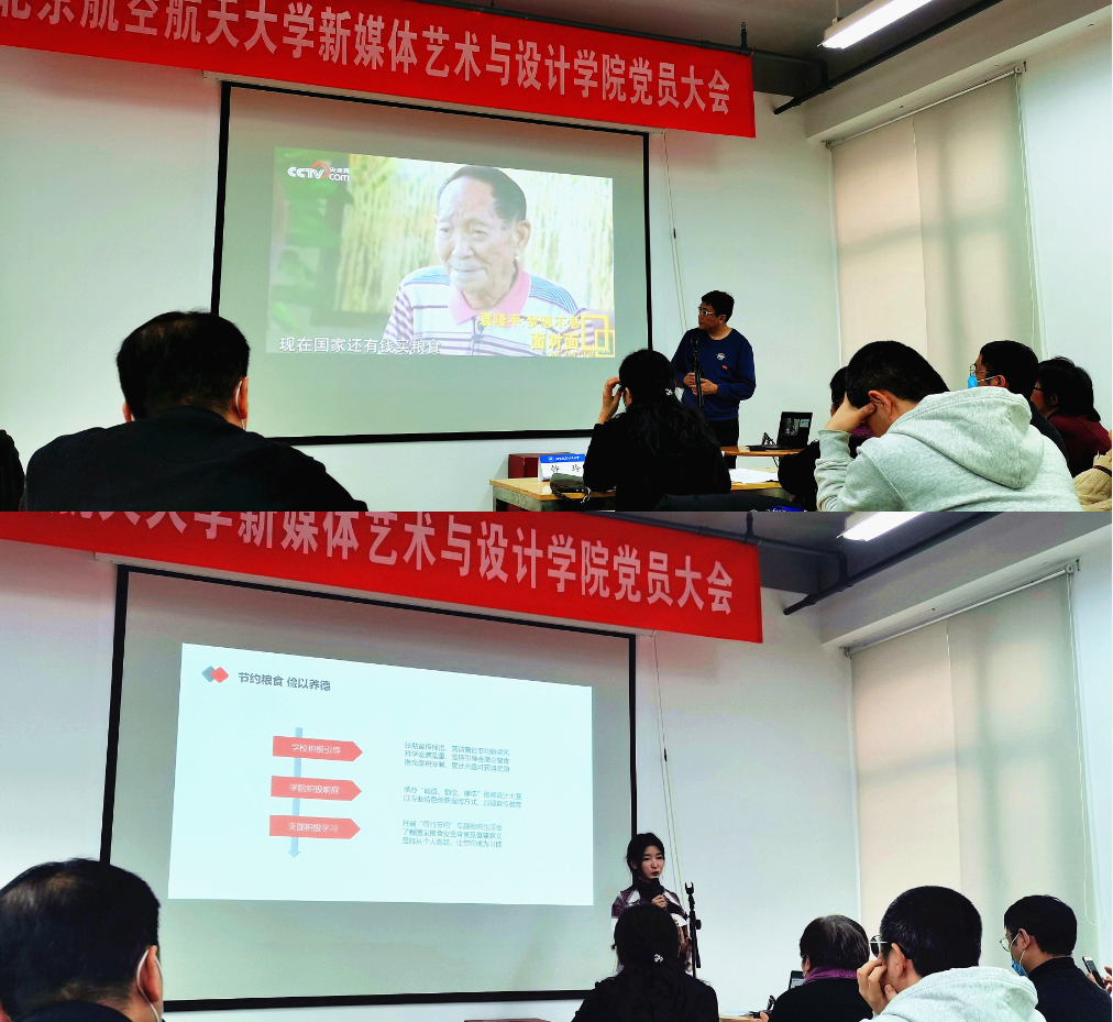 徐梦露重点讲解以“学校积极引导——凯发k8积极响应——支部积极学习”的思路,关于北航师生是如何将一系列有力宣传举措推动餐饮浪费现象有所改观。例如,学校食堂等张贴宣传标语,营造勤俭节约新桌风;科学设置菜量,坚持引导合理点餐食;推光盘积分制,累计光盘可获得奖励。特别是,新媒体凯发k8每年承办的“诚信、勤俭、廉洁”创意设计大赛,通过一些海报创意设计等以专业特色的创新宣传方式,加强宣传教育。并且,凯发k8所有党支部在今年11月开展了“厉行节约”专题组织生活会,领学“厉行勤俭节约、反对铺张浪费”重要批示精神,了解国家粮食安全背景及重要意义,坚持从个人做起。