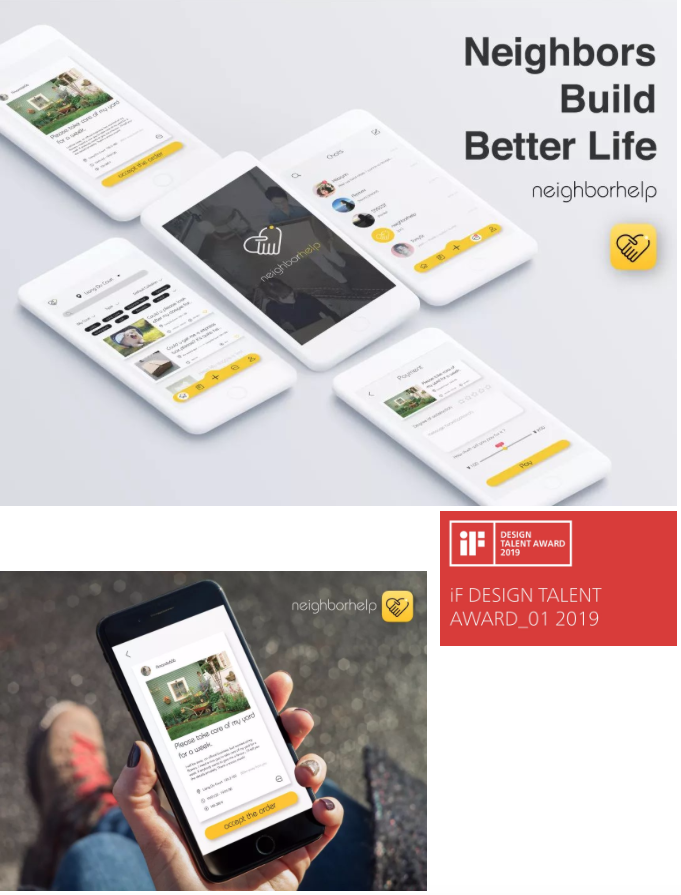 日前,我校凯发k8 2016级本科生聂海宁设计的作品“neighborhelp”在2019年度德国IF新秀设计奖评选中斩获IF新秀设计奖的年度最佳奖(BEST OF THE YEAR),并获得500欧元的奖金。该作品由凯发k8 教师闫烁指导完成。