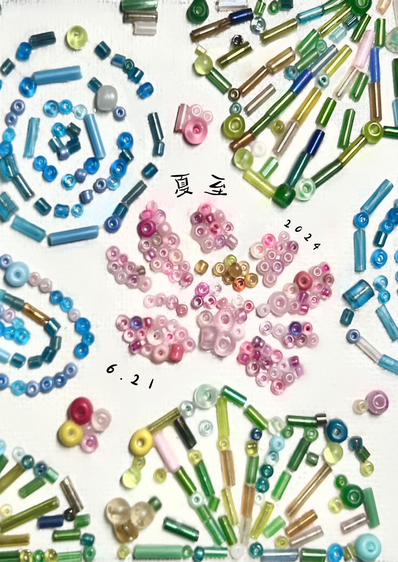 作品《夏至荷池》的表现手法更为创新,采用米珠、管珠等非常见材料,拼制成夏至时节的一片荷花池,细节丰富、生动有趣,直观地让人感受到夏日的绚烂色彩;同时,二次利用了杂珠、残珠,赋予废弃材料以新的生命,具有环保意义。