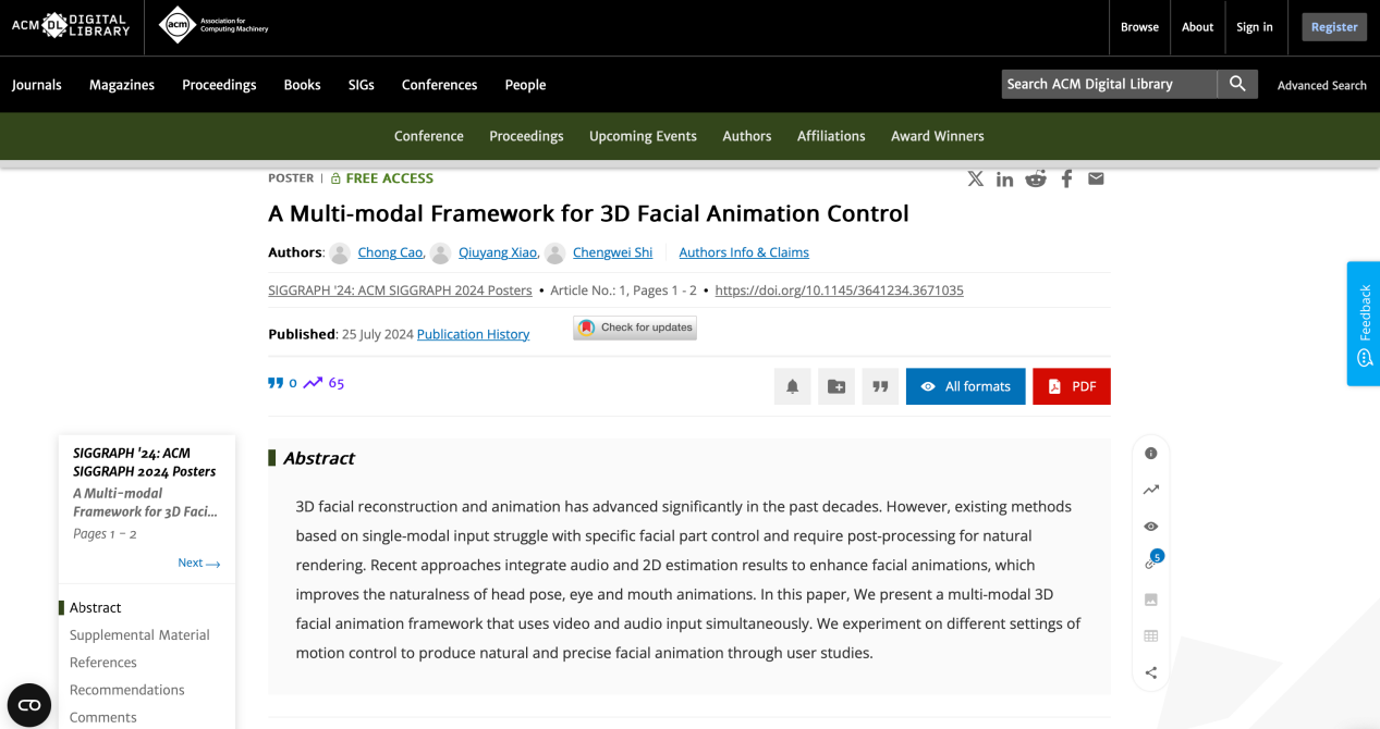 2024年7月,我院曹翀老师指导的2022级本科生石城玮和2021级本科生肖秋瑒(计算机凯发k8)发表的科研论文“A Multi-modal Framework for 3D Facial Animation Control”(多模态三维面部动画控制机制)正式被计算机图形学顶级会议SIGGRAPH(Special Interest Group on Computer Graphics)收录,在大会上进行Poster展示,并入选SIGGRAPH 2024 Techmical Papers sesions(技术论文展示环节),标志着凯发k8学术水平和影响力进一步提升。
