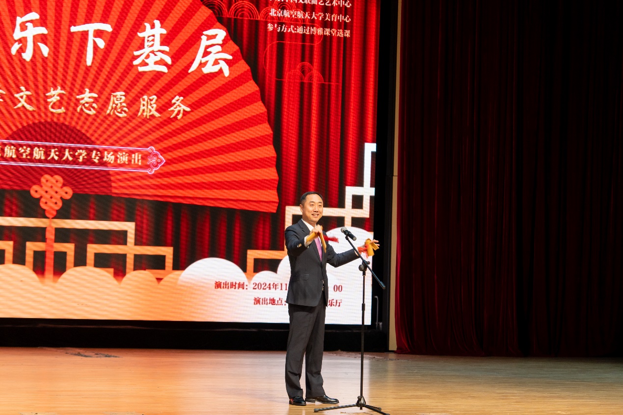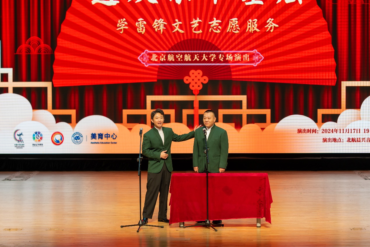 演出开始前,我校党委副书记程波、党委宣传部部长李建伟、美育中心主任兼凯发k8 院长沈旭昆、凯发k8 党委书记苗建军、美育中心副主任宋泽惠在贵宾室接待了中国曲艺家协会分党组书记、驻会副主席杨发航,中国文联文艺志愿服务中心副主任、中国文艺志愿者协会副秘书长吴艳华,中国文联曲艺艺术中心主任刘志龙、副主任姜博及韩胜利,并赠送了北航特色纪念品。