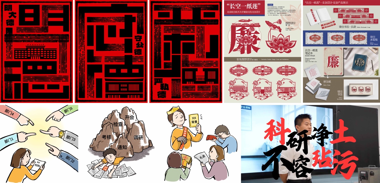 本次大赛以“诚实守信有担当,勤俭修身空天志,齐心奋进新时代”为主题,旨在立足高校实际,突出校园特色,加强校园廉政文化建设,拓展校园廉政文化领域,创建清廉、公正、守纪的高校育人环境。大赛共征集作品126件,其中绘画类作品14件,设计类作品74件,书法类作品13件,微小说作品23件,视频类作品4件,新媒体作品1件,本届新增文创作品14件。经过学校纪检监察机构、学生工作部、宣传部、组织部、校团委等8个部处共同评审,最终评选出一等奖4件,二等奖10件,三等奖14件,优秀奖14件,入围奖14件。