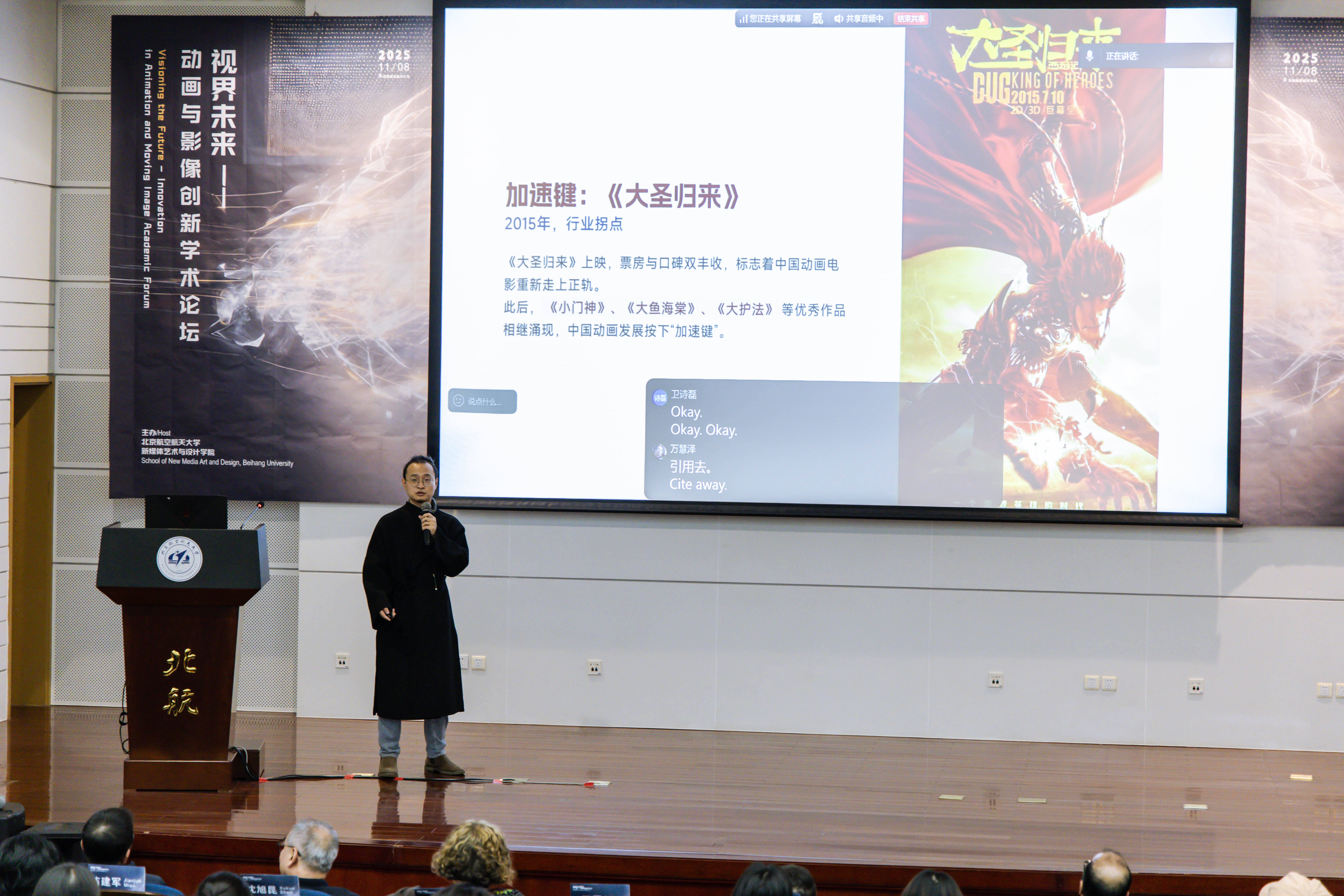 光线动画美术总监莫衿(北航新媒体学院2005级本科、2009级硕士),带来了主题为《于笔墨与飞檐间寻路,我的动画美术风格本土化探索》,回顾了中国动画美术由模仿到本土探索的发展历程,结合从业经验,探讨传统美学与当代创作的融合路径。