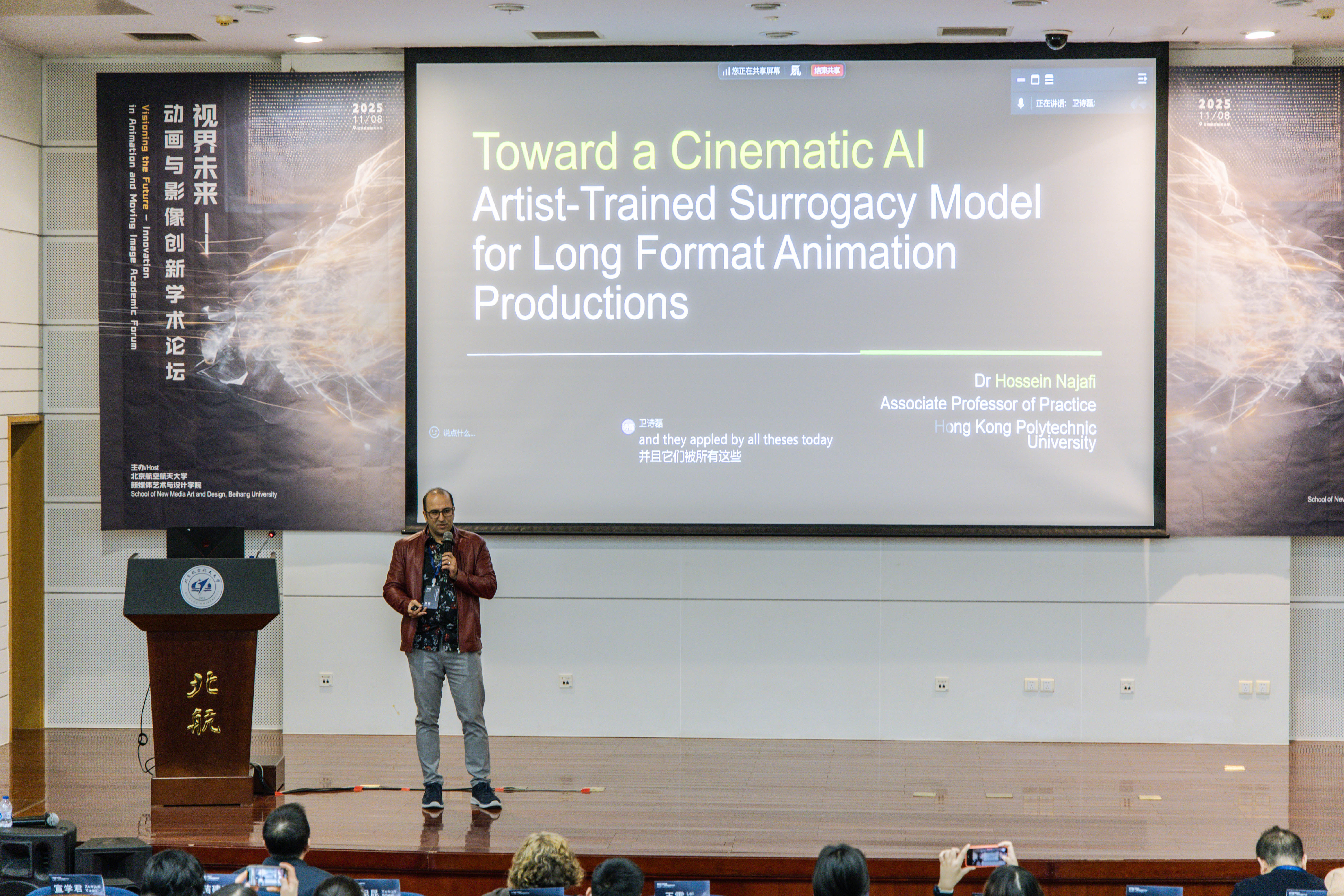 来自香港理工大学设计学院的Hossein Najafi博士带来的《面向长篇动画制作的电影级经艺术家训练AI代理模型》Hossein Najafi博士提出以艺术家专属数据集为核心的AI协作模型,以应对AI影视制作中的角色一致性、影像控制、声音设计及后期等十大挑战。该模型通过可引导、可迭代的流程管线重现传统动画与特效制作机制,并在艺术家与工程师的共创中,重新定义AI的创作代理角色,推动动画迈向电影化的生成方法论。