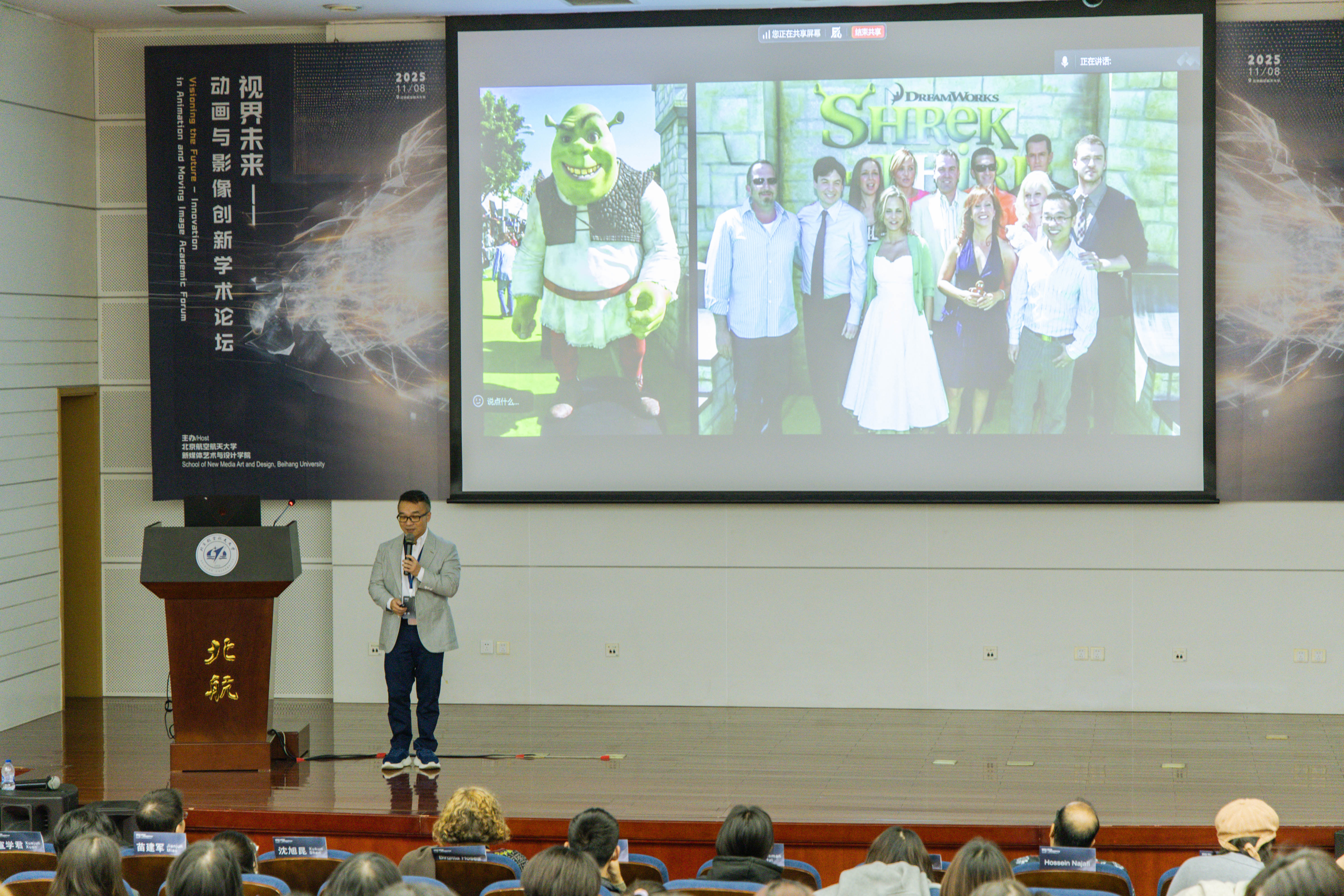 沈旭昆院长在开幕式致辞,表达了对与会嘉宾和院校师生代表的热烈欢迎,他强调论坛既是动画领域的学术交流盛会,也是学院依托多学科资源、推动科技艺术科普融合的重要举措。随后参会人员合影留念,论坛进入主题报告阶段。