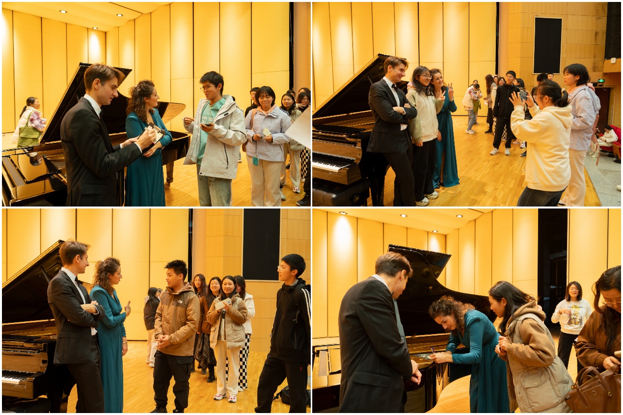 同学们热情不减,纷纷自发上台,与两位钢琴家亲切交流、合影留念。