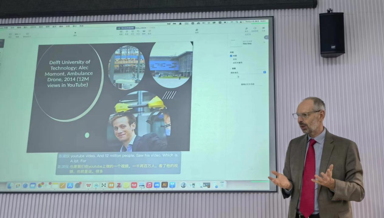讲座中,Cees deBont教授为大家讲述了设计领域近30年的变化与发展,他通过分享职业生涯中的经典案例,详细阐述了其设计实践的关注点从“商业价值”向“环境和社会可持续性”过渡的过程,并展示了相关领域前沿的设计项目和作品。在问答环节,师生们积极互动,Cees教授一一回应,给予了许多针对性的建议和指导,并鼓励同学们敢于创新、勇于尝试、顽强拼搏。师生们纷纷表示深受启发,进一步开阔了师生们的学术视野,激发了学习热情和研究兴趣。