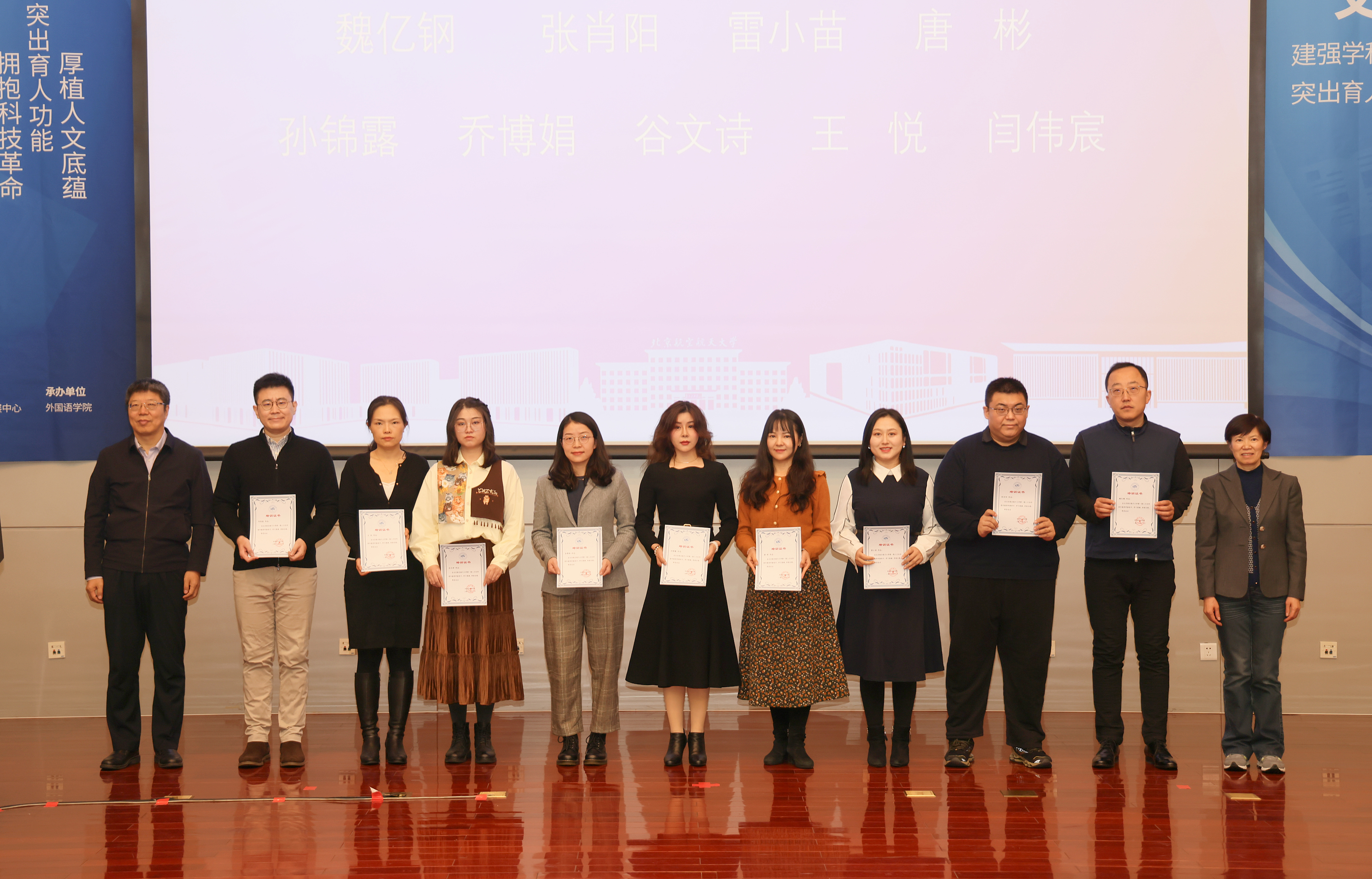 会上,赵长禄为人文社科青年教师研修班校外特聘专家代表颁发聘书。刘树春、张海兰为第一期人文社科青年教师研修班学员颁发培训证书,程波为第二期研修班学员代表赠送《北航青年拔尖人才基础前沿成果系列丛书》。