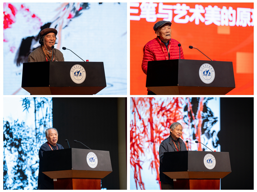 客座教授、清华大学中国画高研班齐辛民工作室导师、国家一级美术师齐辛民以《画中的三笔与艺术美的原理》为主题,基于画家的著作《画中的三笔》中的内容,讲解传统技法中不可缺少的构成形式,从而理解艺术美的原理,领悟艺术如何表现出美感的道理。北京画院艺术委员会委员、北京市高级职称评审委员、国家一级美术师郭石夫以《新时代的大写意之美》为主题,讲述了在中西文化和绘画观念的冲撞中,中国的大写意花鸟画要有新时代的“正大光明”气象。中国国家画院研究员、中国艺术研究院文学艺术院研究员汤立以《大道至简与中国的大写意艺术——兼论艺术与科学的关系》为题,讲述了艺术与科学的关系、大道至简与中国的大写意艺术、中西方艺术的比较及各自发展的路径、“全球化”背景下的文化自信四个方面内容。