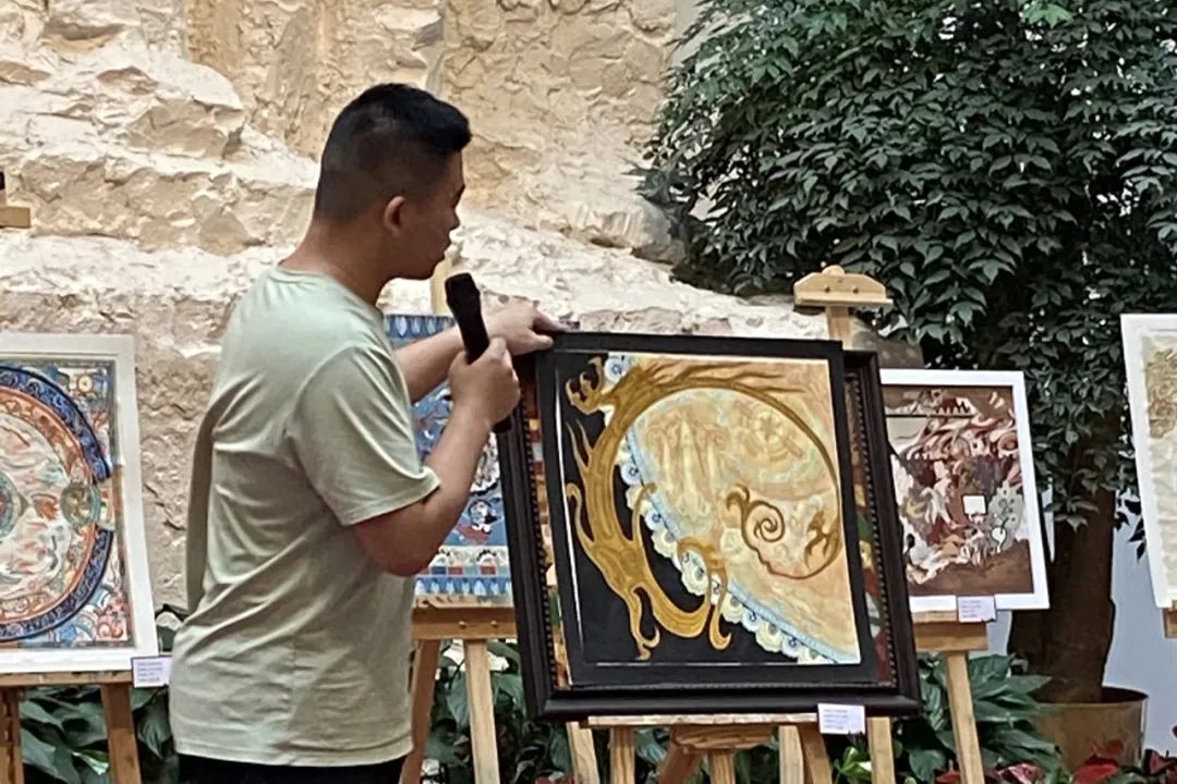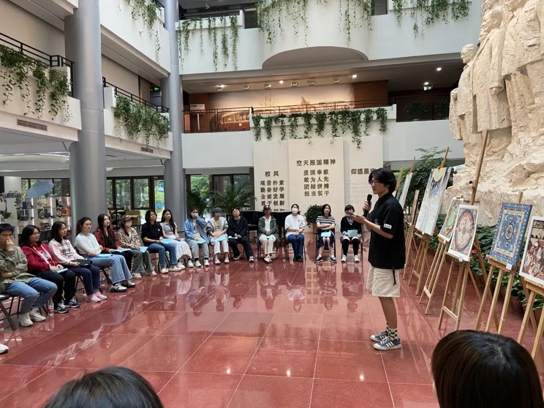 紧接着,杨紫絮、左政轩、张贺、秦尔仪同学分别分享了他们在创作民间绘画作品时的思路与体会。四位同学在创作中将传统敦煌元素与现代航空航天主题相结合,他们通过深入研究和巧妙运用AIGC技术,找到了富有自身特点的方案。杨紫絮同学选择克孜尔壁画为底表现航天发展历史,左政轩同学借鉴敦煌妆容特点表达“飞天”主题,张贺同学将航天器结合应龙纹与玉器纹路,秦尔仪同学则将火箭与传统火焰纹样相融合。