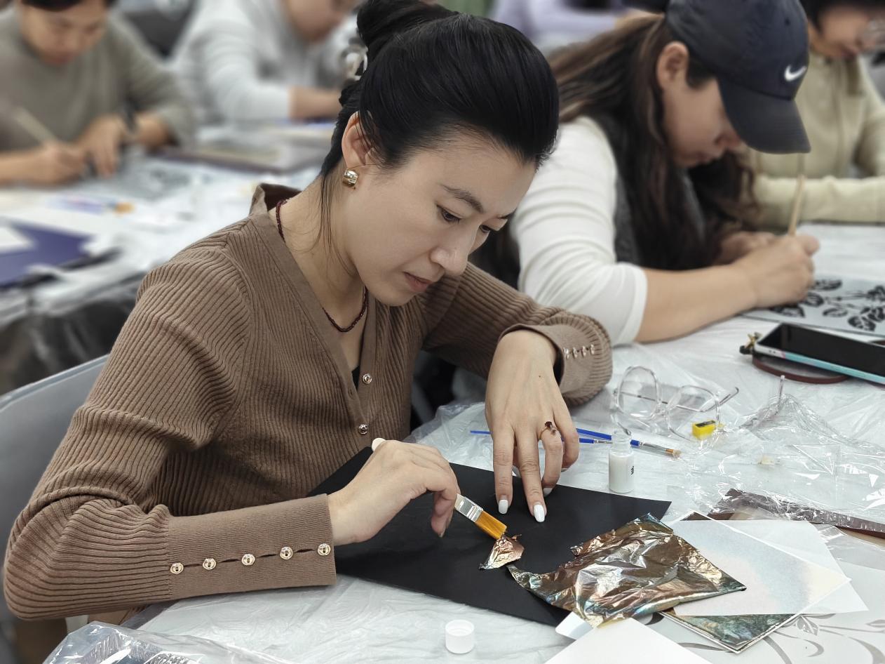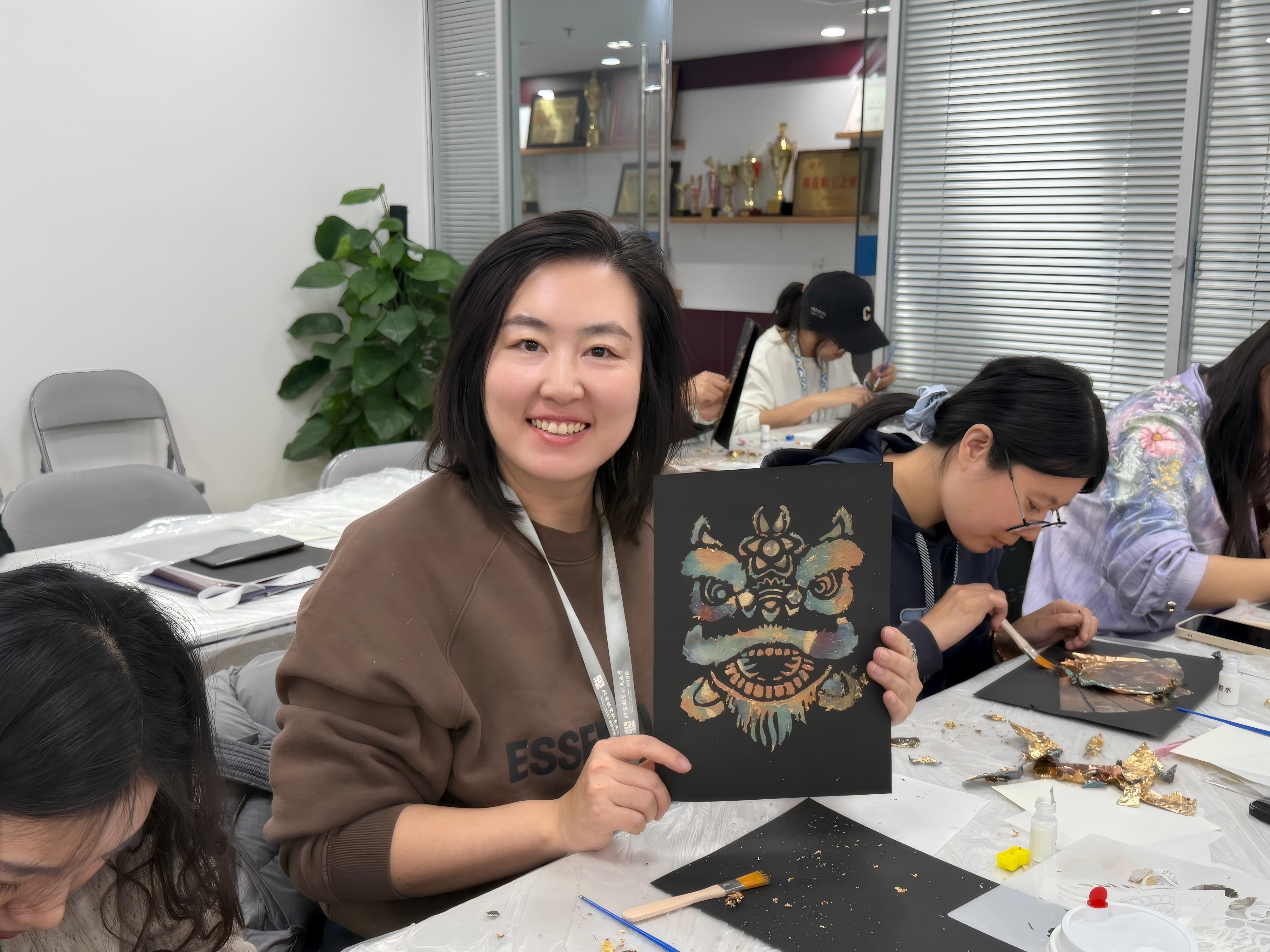 参与活动的老师们纷纷表示,这是一场解压又治愈的艺术体验。有老师分享:“专注于色彩搭配与构图的过程特别放松,能暂时忘却工作压力,感受到创造的纯粹乐趣。”也有老师感慨:“看着不起眼的箔片在手中变成完整的画作,成就感十足,也让我对非遗工艺的魅力有了更直观的认识。”活动尾声,大家纷纷展示自己的作品,互相欣赏点赞,现场洋溢着满满的喜悦与成就感。